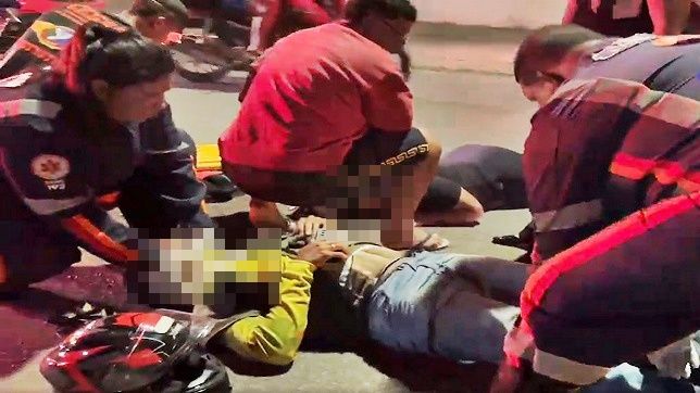 Motociclista e passageira sendo socorridos no local da violenta colisão na noite desta terça-feira
