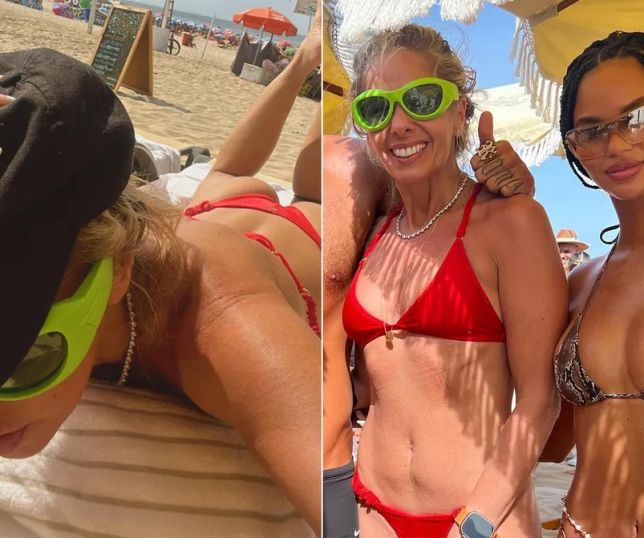 De biquíni, Adriane Galisteu curte praia no Rio e posa com Juliana Nalú, ex de Kanye West