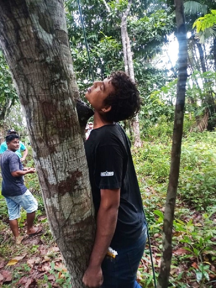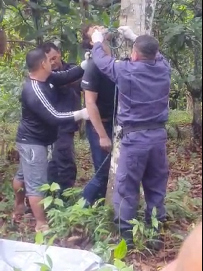 A família já vinha procurando pelo homem que estava desaparecido há quase um dia e com ajuda de moradores da área de mata encontraram o corpo pendurado por uma corda usada como forca em uma árvore.