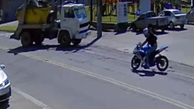 Uma câmera de segurança registrou o momento de um acidente entre uma motocicleta e caminhão que resultou na morte do motociclista.