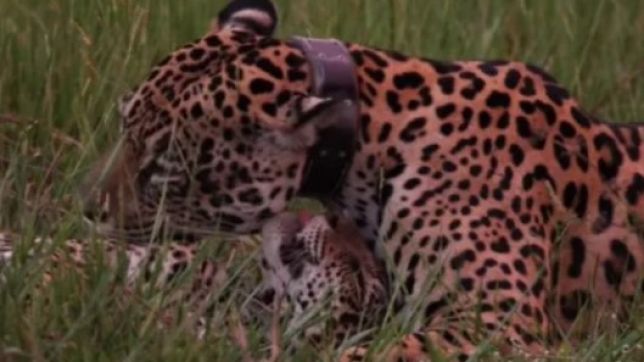 Uma onça-pintada foi flagrada trocando carinhos com seu filhote em uma fazenda do Pantanal, na região do município de Miranda, no Mato Grosso do Sul.