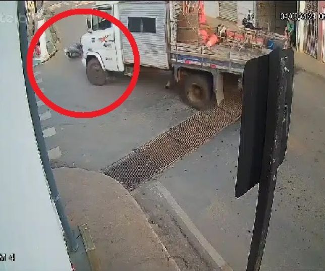 Motociclista se desequilibra e vai parar embaixo de caminhão. TUDO FILMADO. VEJA VÍDEO