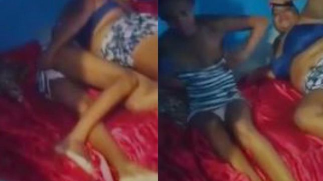 Nas imagens a seguir, assim que o chifrudo ele entra no quarto, dá de cara com a esposa sendo apalpada na bunda, com o vestido abaixado e os seios de fora. A mulher espantada, levanta rapidamente da cama e pega a criança que estava ali no quarto participando de toda essa sem-vergonhice.
