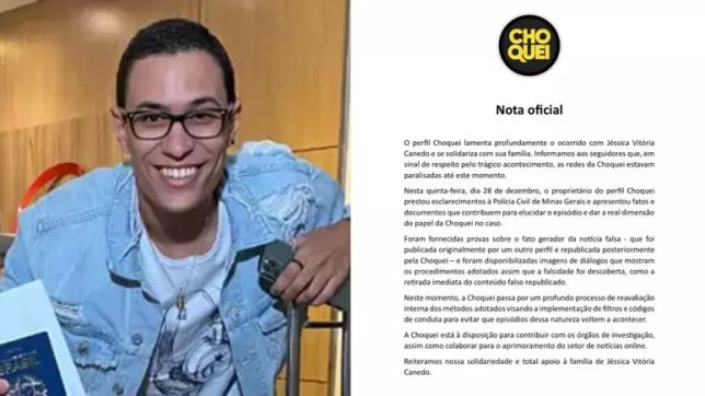 Ainda segundo o comunicado, o fotógrafo Raphael Sousa, responsável pela página, prestou depoimento à Polícia Civil de Minas Gerais. "A Choquei está à disposição para contribuir com órgãos de investigação, assim como colaborar para o aprimoramento do setor de notícias online. Reiteramos nossa solidariedade e total apoio à família de Jéssica Vitória Canedo", encerra a nota.