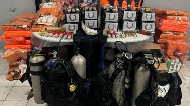 Em um imóvel no bairro Monte Cabrão, em Santos, a polícia encontrou equipamentos próprios para a prática de mergulho: cinco cilindros de oxigênio, quatro roupas de mergulho,33 coletes salva-vidas e 22 sinalizadores náuticos.