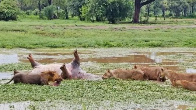 Ele contou ao site LatestSightings que seguiu com a família para uma região onde era possível avistar leões e quando chegaram encontraram os animais admirando um hipopótamo morto na lagoa.