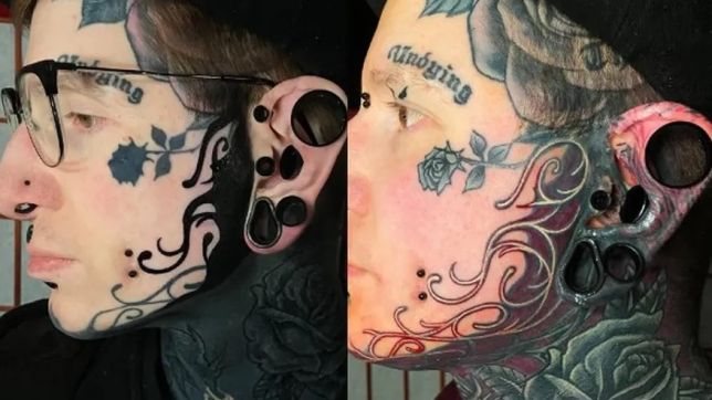 Os braços, as coxas, as costas e até mesmo as nádegas foram decorados com tatuagens em várias camadas, deixando apenas uma pequena parte do seu rosto sobrando.
