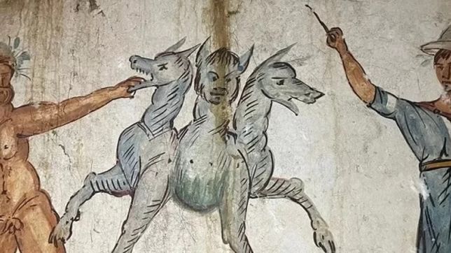 Os afrescos da tumba retratam cenas mitológicas. A mais emblemática delas é a de Hércules em seu último trabalho, lutando contra Cérbero, o cão de três cabeças que guardava a entrada do mundo dos mortos na mitologia grega. Ao lado da cena está o deus-mensageiro Hermes. Como ainda não foi possível identificar quem foi enterrado na tumba, ela ficou conhecida apenas como "Tumba de Cérbero".