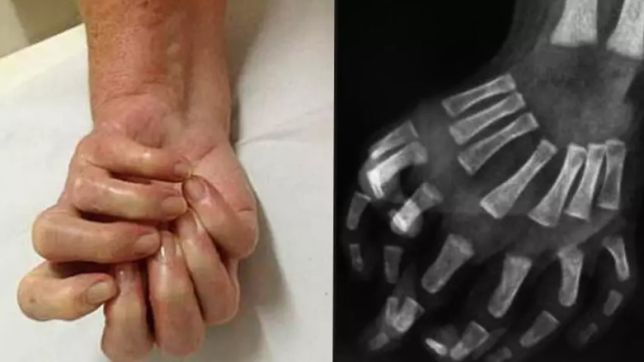 Na maioria dos casos, o indivíduo possui sete ou oito dedos, com os dedos médio, anelar e mínimo aparecendo em ambos os lados do dedo central.