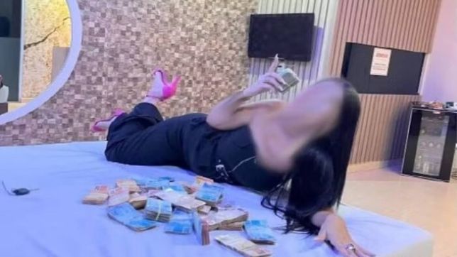 Imagens obtidas nos celular da suspeita mostram ela deitada em uma cama com grande quantia de dinheiro em espécie (foto em destaque). O valor chega a aproximadamente R$ 50 mil.