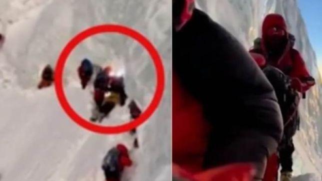 Climbers crossing the most dangerous part of K2; The Bottleneck & the laying man in black & yellow dawn suit is reportedly Muhammad Hassan from Tissar Skardu, who died there and 130 climbers crossed over his body on ascent & descent.