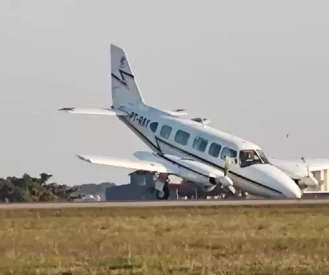 Avião bimotor toca bico na pista após problemas com trem de pouso