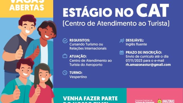 A Empresa Estadual de Turismo do Amazonas (Amazonastur) está com inscrições abertas, até o dia 7 de novembro, para o processo seletivo de estagiários de graduação em Turismo ou Relações Internacionais. A bolsa de estágio tem o valor de R$ 640. Além disso, os estagiários receberão auxílio-transporte no valor de R$ 198.