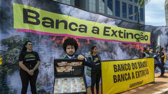 Representantes do Greenpeace Brasil realizaram nesta segunda-feira (15/4) ato em frente à sede do Branco Brasil, em Brasília, contra o financiamento de proprietários de terras suspeitos de grilagem, desmatamento e invasão de territórios indígenas.