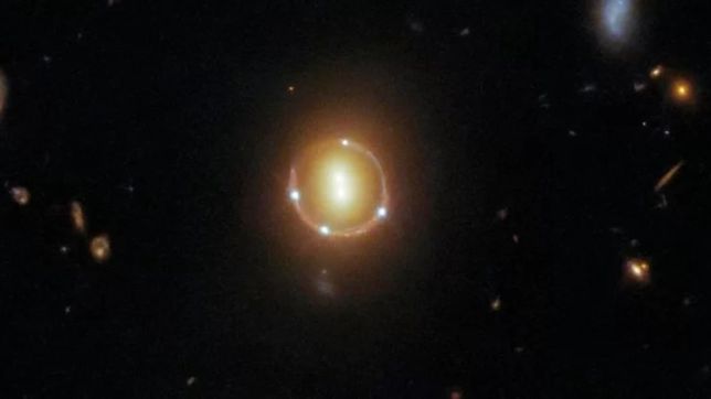 “Consideramos a possibilidade de que o sistema não seja uma lente gravitacional, mas sim uma galáxia em forma de anel, como o objeto de Hoag. Anéis de formação estelar podem ser criados em colisões de frente, e há uma pequena galáxia a sudoeste do anel que poderia ser o perturbador”, o estudo descreve.