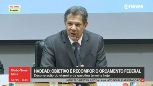 Em entrevista coletiva, Haddad informou a volta de impostos federais sobre a gasolina e o etanol. A gasolina será reonerada em R$ 0,47, e o álcool em R$ 0,02.