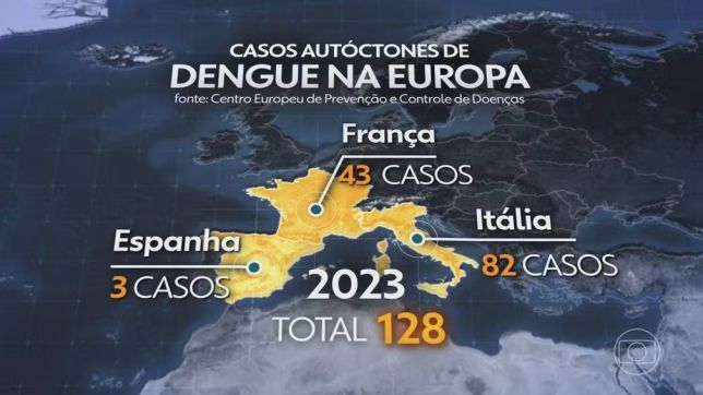 No ano passado, países como França, Itália e Espanha registraram 128 casos de dengue desse tipo. Há dez anos, foram apenas quatro - e só na França. São números pequenos se comparados aos do Brasil, que nas primeiras quatro semanas do ano já registrou mais de 243 mil casos - o triplo do ano passado no mesmo período.
