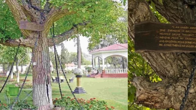 A planta, que fica dentro de uma instalação do exército da província de Khyber, no noroeste indiano, está algemada com correntes que prendem seus inúmeros galhos até o chão. Para completar o cenário, existe uma antiga placa, como se fosse uma confissão da árvore, que começa com: "Eu estou presa!".