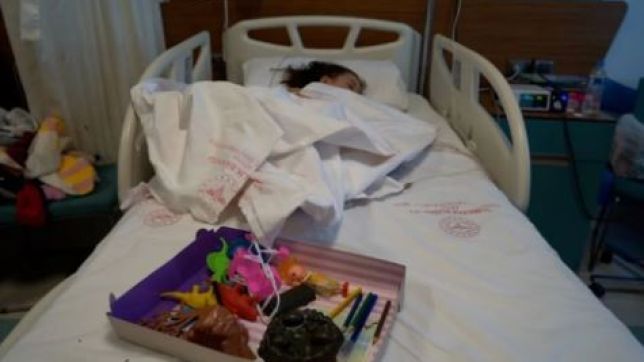 Nos deparamos com uma menina que os médicos dizem ter cinco ou seis anos. Ela está dormindo, com soros intravenosos. A equipe diz que ela teve um traumatismo craniano e fraturas múltiplas.
