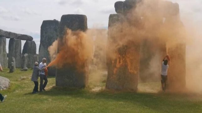 A polícia local informou, em comunicado, que duas pessoas estão presas por suspeita de danificar a estrutura. O grupo divulgou nas redes sociais o vídeo do momento em que dois manifestantes correm em direção a dois dos monumentos megalíticos de Stonehenge e jogam tinta, enquanto outra pessoa tenta os impedir.
