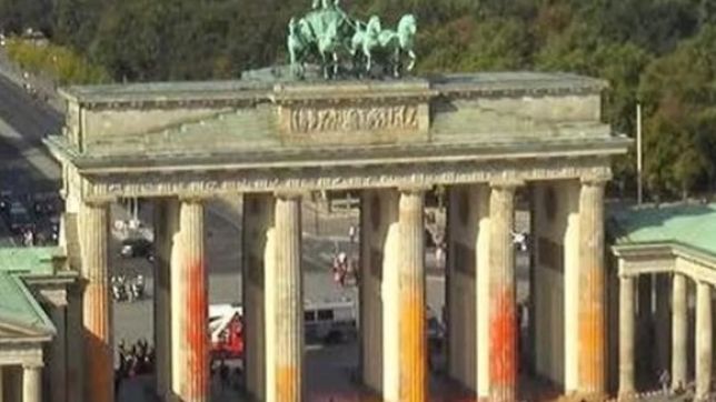 No protesto no Portão de Brandemburgo, o grupo admitiu que foram usados extintores de incêndio para borrifar a tinta nas colunas do monumento, completado em 1791. O grupo pretendia executar uma ação ainda maior, mas a polícia impediu que manifestantes subissem no local.