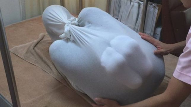 “Pensamos que se os adultos fossem embrulhados como eles, poderiam ver como é bom”, explicou Orie Matsuo, terapeuta da Kyoko Proportion, uma das empresas que oferece o serviço, para o jornal britânico BBC. Um pedaço de tecido respirável e de trama solta é usado para o procedimento, que embrulha todo o cliente.