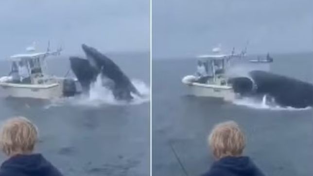 Baleia-jubarte salta e vira barco de pesca nos EUA