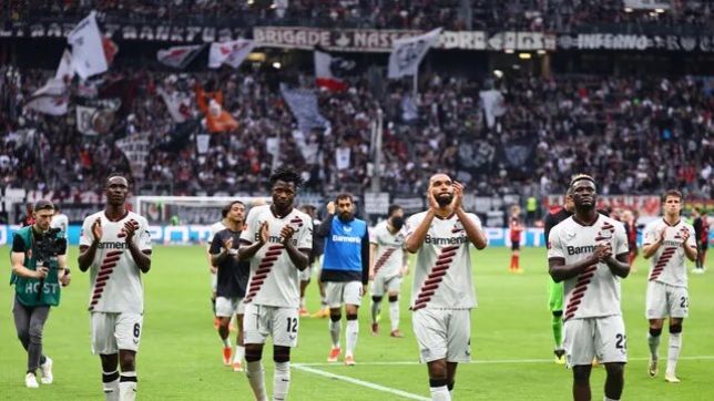 Jogadores do Bayer Leverkusen agradecem à torcida após goleada sobre o Eintracht Frankfurt