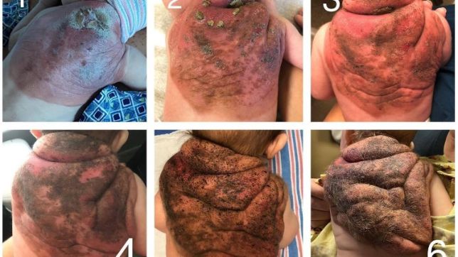 Ela relatou, ainda, que houve um crescimento rápido da lesão, que chegou a cobrir cerca de 75% das costas da criança. Entretanto, a realização de ressonâncias magnéticas atestou não haver crescimento de massa em seu interior.