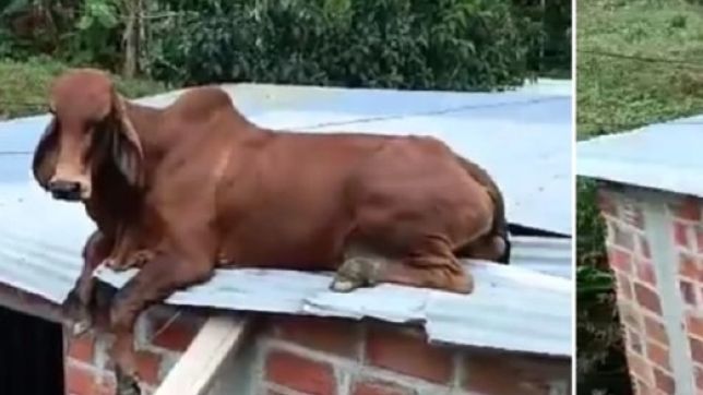 Uma cena bizarra foi registrada em vídeo na cidade de Anorí, no nordeste do estado de Antioquia, na Colômbia: um bezerro foi encontrado em cima do telhado de uma casa.