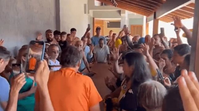 Os outros apoiadores presentes no local reagem dizendo “amém”. A mulher finaliza pedindo “que os inimigos do nosso presidente tenham olhos, mas não possam vê-lo, tenham mãos e não possam tocá-lo, tenham pernas e não possam alcançá-lo”. Bolsonaro abraça a mulher enquanto é ovacionado aos gritos de “mito”.
