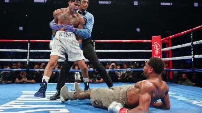 Ryan Garcia é segurado pelo árbitro após knockdown em Devin Haney
