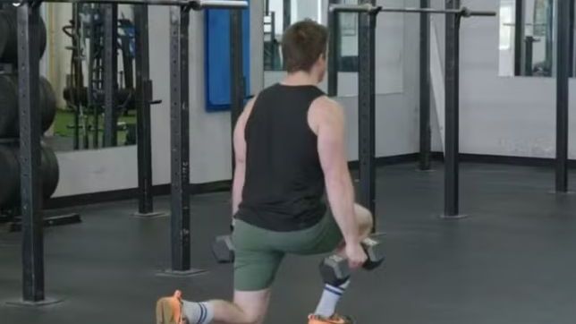 Faça três séries de 10 repetições de caminhada de cada lado em cada. Em cada repetição, com o joelho de trás a alguns centímetros do chão, levante-o alguns centímetros. Então dê o próximo passo. A pulsação ataca os glúteos em uma posição alongada.