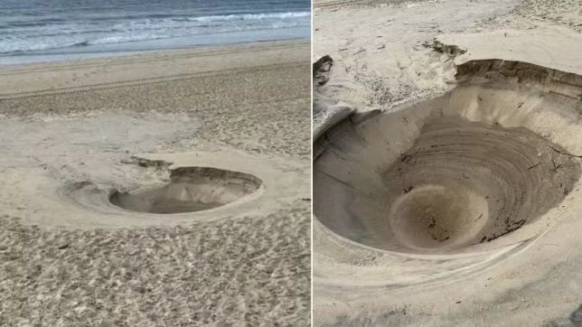 Um buraco aberto na areia de Main Beach, em Gold Coast (Austrália), intrigou banhistas.A "misteriosa" e borbulhante cratera de mais de 2 metros de diâmetro foi descoberta por Carolyn Evans, quando ela dava nesta semana uma caminhada pela areia da praia.