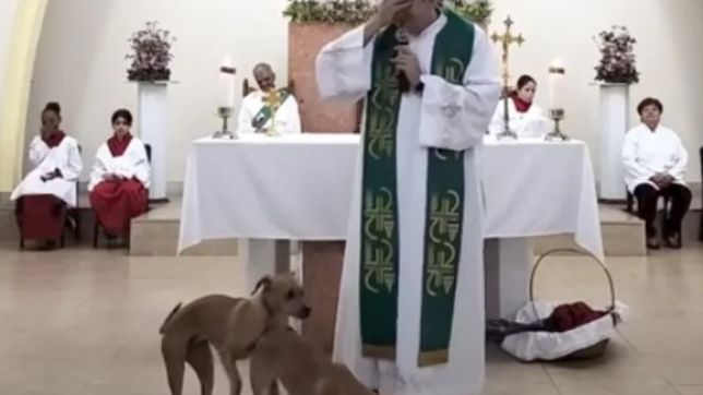 “Eles não foram batizados ainda, não é possível”, brincou o padre, enquanto os cachorros o cercavam. Após alguns segundos de interrupção da fala e tentando retomar seu raciocício, Pierre é surpreendido por uma atitude inesperada dos vira-latas.