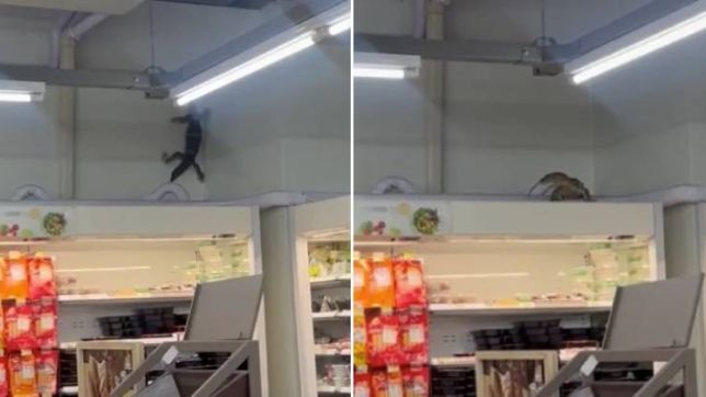 Bem-vindo ao Jurassic Park! Ou a um mercado em Nakhon Pathom, na Tailândia, onde um lagarto-monitor enorme surgiu do teto e andou de um lado para o outro sobre uma das geladeiras do estabelecimento.