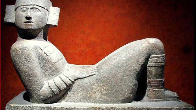 Um exemplar de Chac Mool encontrado no Templo Mayor, o principal da cidade asteca de Tenochtitlán (atual Cidade do México) reúne o formato da figura com várias outras características e cores associadas a Tloloc, o deus da chuva.