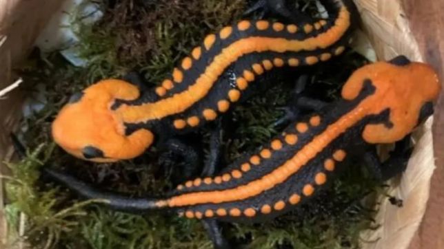 O animal de aparência peculiar, que foi apelidado de Tylototriton ngoclinhensis, tem cor preta com manchas laranja fluorescentes em cada lado de suas costas.