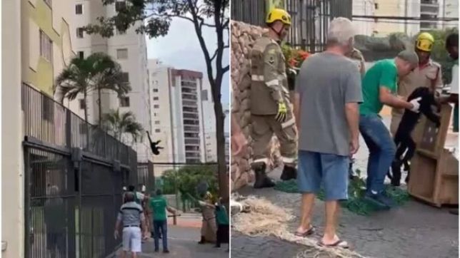 Imagens divulgadas pela corporação mostram o momento em que o macaco, após ser tranquilizado com dardos sedativos, cai em uma rede preparada pela equipe de resgate.