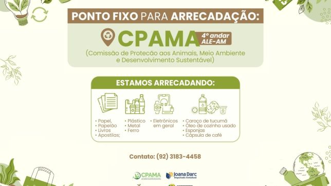 A Comissão de Proteção aos Animais, Meio Ambiente e Desenvolvimento Sustentável da Assembleia Legislativa do Amazonas (CPAMA-Aleam) passará a ser considerada como ponto fixo para coleta de resíduos recicláveis, resultado da primeira Ação Sustentável, em parceria com o “Drive-Thru Ambiental”, de Manaus. Além disso, toda primeira quarta-feira do mês terá um veículo para retirada do material.