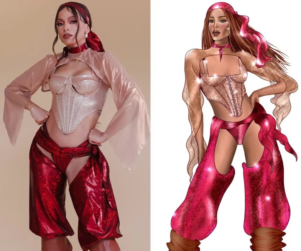 Desde 2019, Clara Lima está em “relacionamento sério” com Anitta, para quem pensa os looks dos shows, das campanhas publicitárias e dos editoriais de moda. Apesar de ter carta branca da funkeira para criar, neste ano a ideia partiu da cantora de Honório Gurgel.