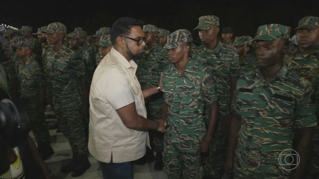 Mas a região é contestada desde o século XIX. Os venezuelanos afirmam que foi roubada pelos britânicos na hora de traçar as fronteiras. Neste domingo (10), o presidente guianês, Irfaan Ali, passou as tropas em revista. Ele disse ao Jornal Nacional que o Brasil pediu para atuar como intermediador da conversa da Guiana com a Venezuela.