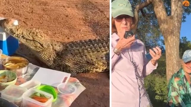 O pequeno evento era realizado por um grupo de idosos, que se reuniu após avistar alguns guepardos na reserva natural. Para comemorar, eles começaram a comer, até um crocodilo sair da água e estragar a festa! O animal coloca a boca em cima do resfriador e fica por lá, aparentemente tomando sol e sentindo a "presa".