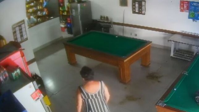 Nitidamente irritada, a mulher entrou no bar e esbravejou contra Marcus, que está do outro lado do balcão. Ela anda pelo estabelecimento e, quando menos se espera, despeja um saco cheio de fezes no chão, próximo a duas mesas de sinuca.