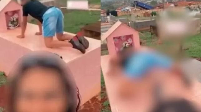 Um dos suspeitos chega a se agachar em cima do túmulo, enquanto uma mulher grava e sorri.