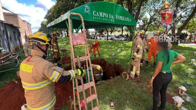 O Corpo de Bombeiros do Distrito Federal (CBMDF) foi acionado para socorrer 10 pessoas que caíram dentro de uma cova após a laje de duas sepulturas vizinhas ceder. O incidente aconteceu durante um enterro, na tarde deste sábado (20/1), no cemitério Campo da Esperança, em Taguatinga.
