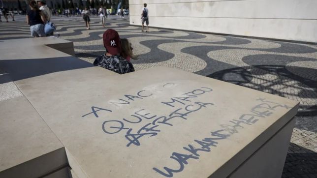 Wakanda para sempre, referência ao filme Pantera Negra, também faz parte do protesto no monumento, erguido durante a ditatura de António Salazar