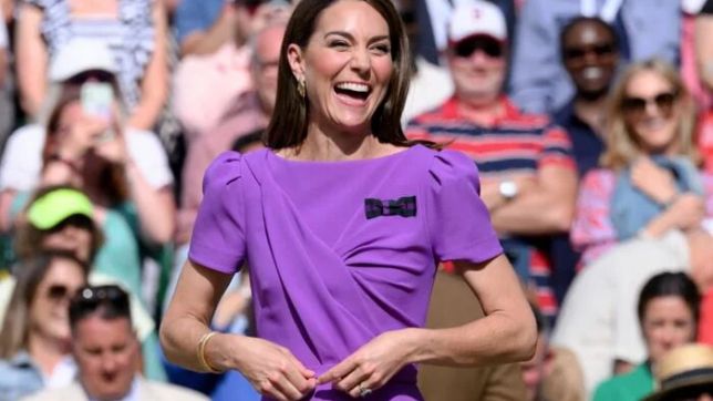 O look de Kate Middleton, usado em Wimbledon, é da marca britânica de luxo Safiyaa. Trata-se de um vestido acinturado, com saia rodada e mangas levemente bufantes. De acordo com as especialistas, até a nuance mais vibrante de roxo escolhida é provavelmente intencional e estratégica.