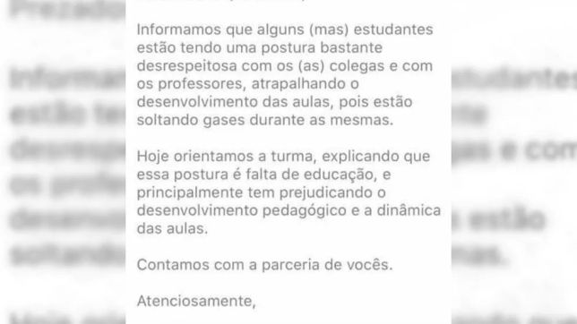 De acordo com o texto, que foi encaminhado por meio do aplicativo do colégio, alguns estudantes estariam “tendo uma postura bastante desrespeitosa com os colegas e com os professores” durante as aulas, "pois estão soltando gases durante as mesmas".