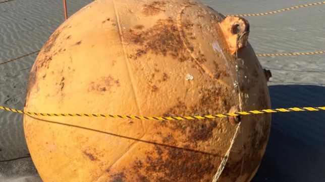 Uma esfera de ferro de cerca de 1,5 metro de diâmetro apareceu na terça-feira (21) em uma praia na cidade de Hamamatsu, no Japão, e as autoridades do país ainda não sabem o que é o objeto.